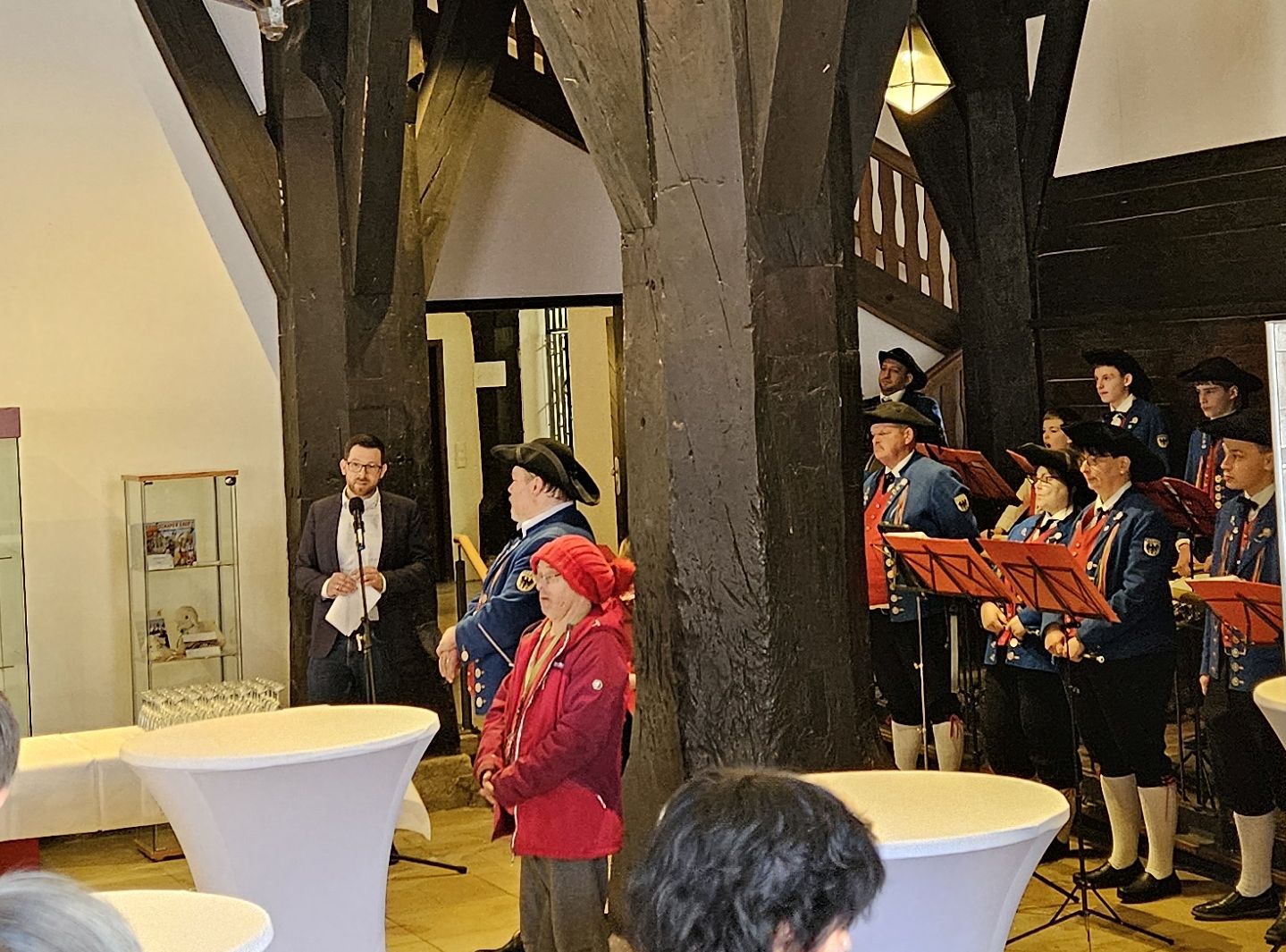 Nach einem kurzen Platzkonzert auf dem Marktplatz wurde die feierliche Eröffnung der Ausstellung im Rathaus begangen, auch hier begleitet durch die Klänge des Spielmannszuges. Bürgermeister Jens Hübner, Schirmherr des Jubiläums, würdigte das Engagement des Spielmannszuges. In seiner Rede hob er den Stellenwert dieser Sparte des Musikvereins für die Stadt Markgröningen hervor und bekräftigte, wie wichtig ihm persönlich die musikalischen Einsätze des Spielmannszuges, z.B. das Wecken am Schäferlauf, sei. Eine solch lange Geschichte eines Vereins sei nur möglich durch das Engagement vieler. So würdigte Alexander Mandel auch das Engagement der vielen Ehrenamtlichen im Laufe der Geschichte und aktuell den Einsatz von Jacqueline Pinto Almeida als Spartenleiterin und Georg ter Voert jun. als musikalischen Leiter.