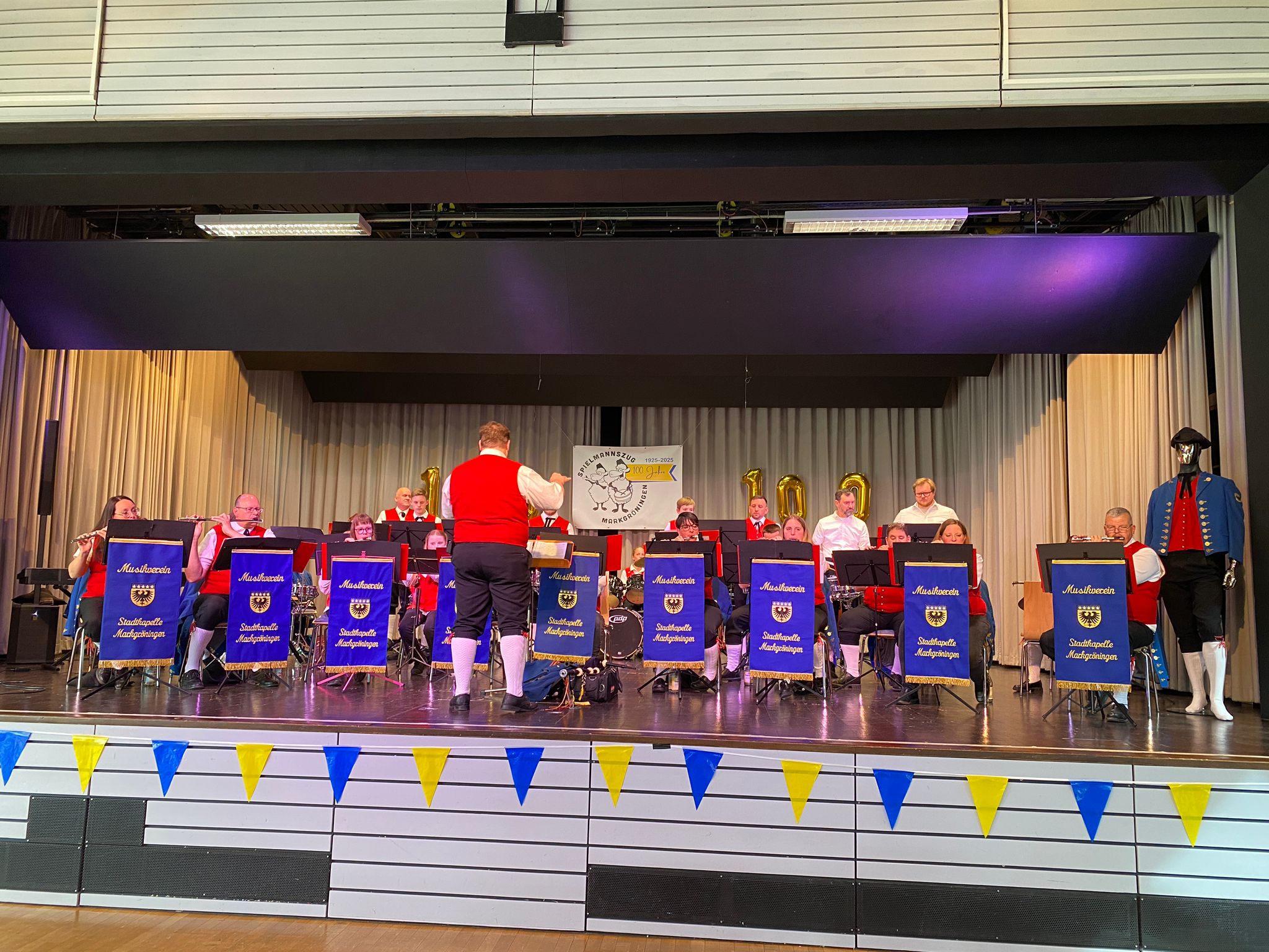 Der Beginn des Jubiläumsfests fand am Freitag für geladene Gäste im Foyer der Stadthalle statt. Im Mittelpunkt standen die Musikerinnen und Musiker selbst. Viele Ehemaligen waren der Einladung gefolgt und mit einer großen Auswahl an alten Bildern wurden Erinnerungen an die letzten Jahrzehnte des Spielmannszugs ausgetauscht. Ein gemütlicher Rahmen und ein gelungener Auftakt!
