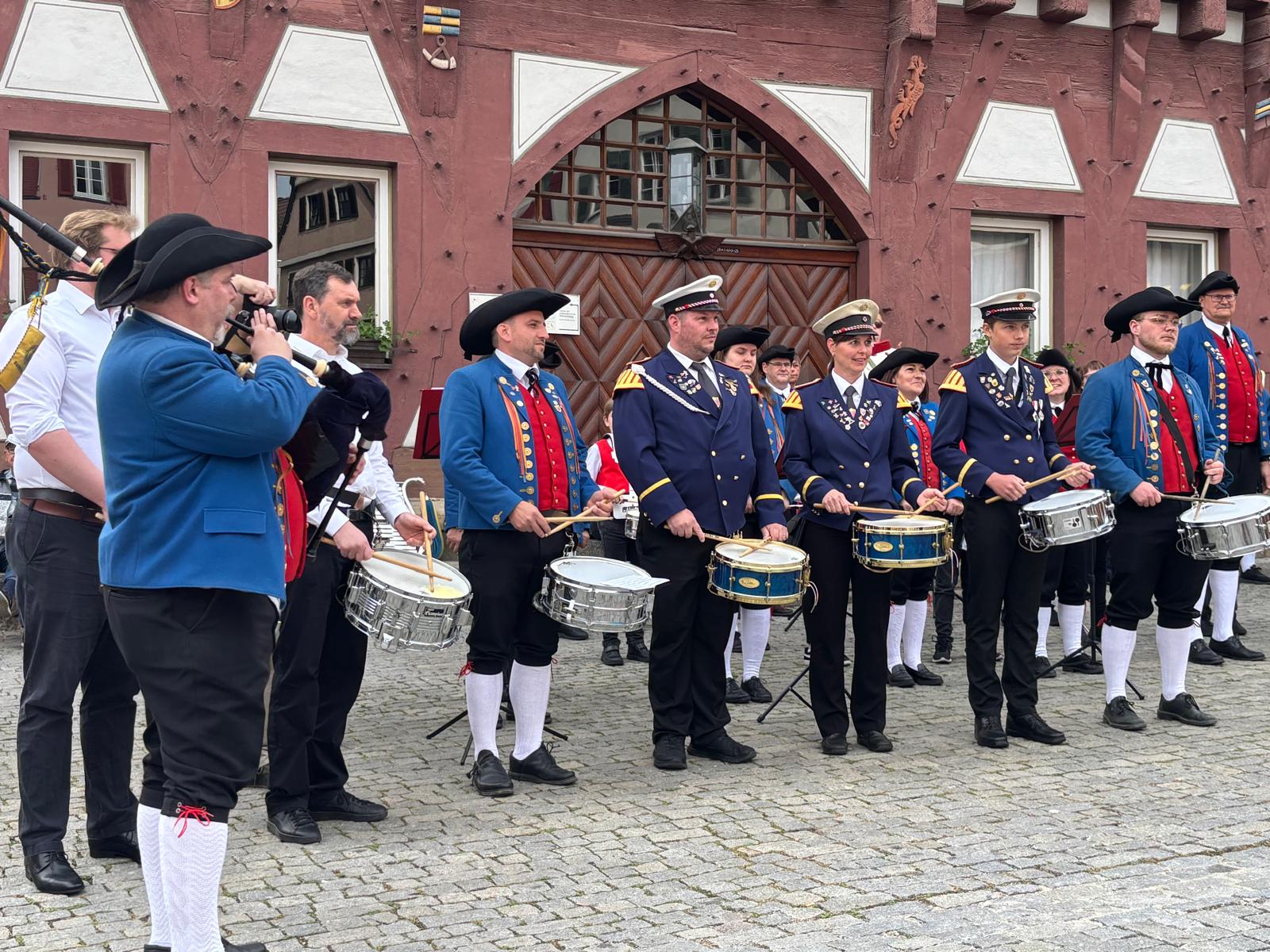 Offiziell eröffnet wurde das musikalische Wochenende am Samstag, den 24. Mai um 16 Uhr im Herzen von Markgröningen: Auf dem Marktplatz. Nach einem Sternmarsch der Gäste, dem Grenzlandtambourkorps aus Anholt in Westfalen und dem Fanfarenzug aus Tamm als auch dem Blasorchester sowie dem Fanfarenzug des eigenen Musikvereins konnte Bürgermeister Hübner zahlreiche Zuhörer auf dem Marktplatz begrüßen und bedankte sich für den kulturellen Beitrag des Spielmannszug am städtischen Leben. Als Höhepunkt der gemeinsamen Serenade, bei der sich alle Gruppen musikalisch vorgestellt hatten, erklang Highland Cathedral, gespielt von allen anwesenden Musikerinnen und Musikern. Ein echter Gänsehautmoment!