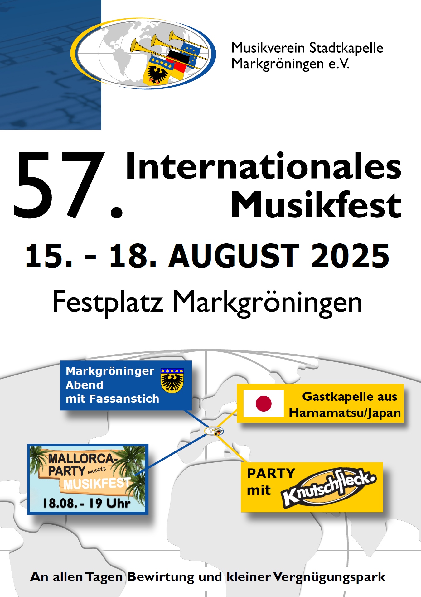 Vom 15. bis zum 18. August 2025 feiert der Musikverein Stadtkapelle Markgröningen e.V. sein 57. Internationales Musikfest. Der Musikverein freut sich sehr, dass die Stadtkapelle Hamamatsu aus Japan und das Trommler- und Pfeiferkorps aus Strauch die Einladung nach Markgröningen angenommen haben. Bei der MALLORCA-Party am Montagabend werden wieder bekannte Stars vom Ballermann dabei sein. Das Publikum erwartet somit ein abwechslungsreiches, viertägiges Programm mit vielen Highlights.